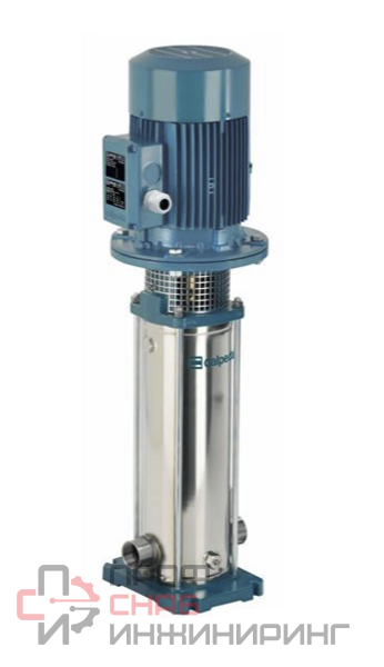 Насос Calpeda MXV-B 40-910/B – это итальянский вертикальный многоступенчатый насос высокого давления. Насос имеет 10 рабочих ступеней. Предназначен для перекачивания чистых промышленных, бытовых, сельскохозяйственных жидкостей. Корпус насоса и все внутренние элементы изготовлены из хромоникелевой нержавеющей стали AISI 304 (вал AISI 303). Резьбовые патрубки равного диаметра G 1 1/2" (40 мм), расположены на одном и том же валу. Производительность насоса от 5,0 до 13,0 м3/час (от 83,3 до 216,6 л/мин.), напор до 119 метров водяного столба. Оптимальная рабочая точка производительности 10,0 м3/ч (166,6 литров в минуту) при давлении 86,0 метров водяного столба. КПД насоса в указанной точке составляет около 62 %. Насос оборудован трехфазным двигателем 380 В, 50 Гц, 2900 об/мин (2Р), номинальная мощность двигателя 3,7 кВт.Акустическое давление во время работы насоса находится с пределах санитарных норм и составляет < 69 дБ (А).
