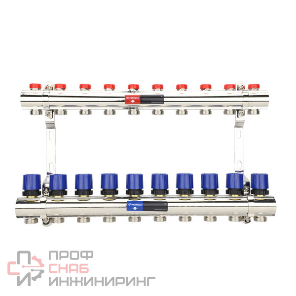 Коллекторные группы из латуни под брендом Varmega предназначены для распределения и регулирования потоков теплоносителя в высокотемпературных (VM158XX) системах отопления. В качестве «потребителя» выступает прибор отопления, контур или петля «теплого пола», а также, отдельные части или ветви системы. Коллекторная группа состоит из двух латунных коллекторов, смонтированных на кронштейнах. На каждом отводе подающего коллектора, установлены ручные балансировочные вентили или расходомеры (ротометры), комбинированные с балансировочными вентилями. Такая конструкция позволяет настроить (сбалансировать) контуры системы отопления. Использование коллекторных групп с расходомерами позволяет произвести настройку, ориентируясь на объективные данные. Каждый отвод обратного коллектора снабжён термостатическим вентилем, который возможно регулировать вручную, а также установить на него электрический привод с присоединением М30×1.5. Присоединение циркуляционных петель осуществляется с помощью фитингов стандарта 3/4" «евроконус». Количество отводов для подключения контуров отопления у коллекторных групп варьируется от 2 до 13. Коллекторные группы поставляются без концевых групп, заглушек и фитингов, но комплектуются ими отдельно.