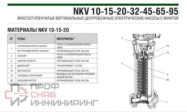 Корпус напорной и всасывающей камер – чугун с антикоррозионным покрытием. Рабочие колеса, диффузоры и крышки диффузоров – технополимер. Износные кольца – нержавеющая сталь AISI 304. Вал гидравлики из нержавеющей стали AISI 416 и соединительная муфта из нержавеющей стали AISI 316. Подшипник центрующего диффузора из бронзы смазывается перекачиваемой жидкостью. Торцевое уплотнение – графит/керамика. Валы двигателя и гидравлики соединены жесткой муфтой. В комплект поставки входят резьбовые ответные фланцы. Насосы комплектуются асинхронным электродвигателем с воздушным охлаждением. Для обеспечения низкого уровня шума и длительного срока службы ротор вращается на подшипниках увеличенного размера, заполненных смазкой на весь срок службы. В однофазной версии встроена защита от перегрузки. Для защиты трехфазного электродвигателя следует обеспечить защиту от перегрузки, соответствующую действующим нормам.
