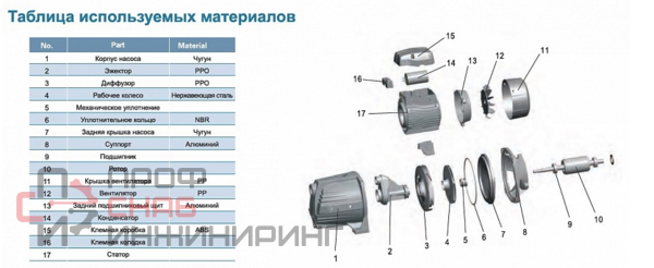 Данный струйный насос используется для перекачивания чистой воды или других жидкостей с такими же физическими и химическими свойствами. Он применяется для водоснабжения небольших жилых построек, автоматических систем полива, малых систем кондиционирования и вспомогательного оборудования. Насос является самовсасывающим и не требует предварительного заполнения рабочей камеры водой, за исключением первого пуска. Насос имеет рабочую камеру из чугуна.