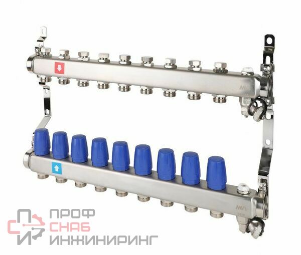 Коллекторные блоки MVI предназначены для распределения потока рабочей среды систем водяного отопления по потребителям. При этом под «потребителем» понимается отдельный нагревательный прибор или группа приборов, контур или петля «теплого пола», отдельные части или ветви системы. Коллекторный блок объединяет в себе подающий и обратный коллекторы из нержавеющей стали, запорные клапаны, термостатические клапаны (с возможностью установки электротермического сервопривода) и крепежные кронштейны. Коллекторные блоки могут работать как на водяном, так и низкозамерзающем (гликолевом) теплоносителе. Коллекторные блоки выпускаются с количеством выходов от 2 до 12. Присоединение циркуляционных петель осуществляется с помощью фитингов стандарта «евроконус» 3/4" (НР).