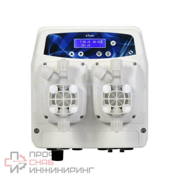 eTwin – простая в использовании станция дозирования и контроля уровня рН и Redox (или свободного хлора) для плавательных бассейнов, объёмом до 500 м3, которая состоит из двух мембранных дозирующих насосов и контроллера, встроенных в один корпус.