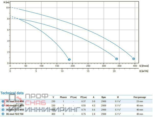 Насосные агрегаты типа DG-Steel - погружные с открытым рабочим колесом и вертикальным подающим патрубком. Проточная часть насоса, рабочие колеса выполнены из нержавеющей стали; имеют водяное охлаждение двигателя.Назначение: для слегка загрязненной воды с взвешенными частицами с диаметром до 40 мм температурой не более 40° С. Кратковременно до 90° С (максимум на 3 мин.)