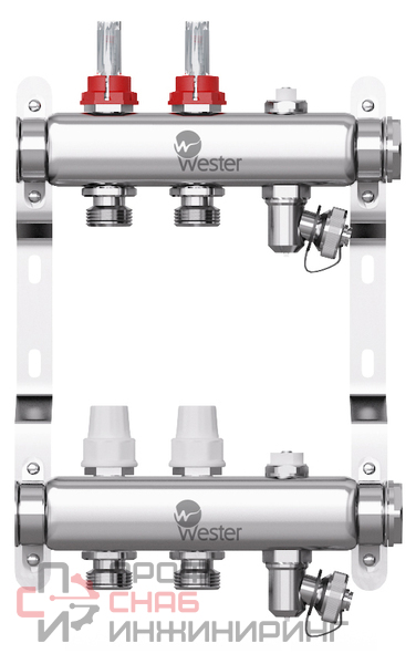 Коллектор Wester из нержавеющей стали с регулирующими и запорными клапанами, предназначен для оптимизации и контроля распределения теплоносителя в системах радиаторного отопления и подогрева пола. Укомплектован кронштейнами для крепления в распределительном шкафу или на стене, переходниками, воздухоотводчиками для удаления кислорода и дренажными кранами для операций заполнения/слива системы. Присоединение 3/4" под "евроконус". На каждой отходящей линии распределителя установлен регулировочный клапан. На каждой входящей линии распределителя обратки установлен запорный клапан.
