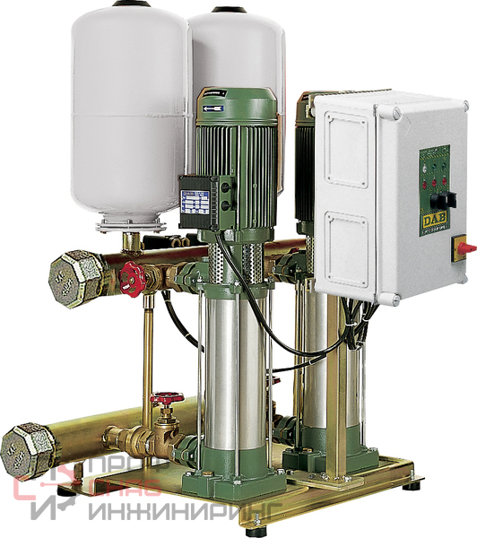 Данные насосные станции комплектуются двумяили тремя вертикальными многоступенчатымицентробежным насосами KV 3-6-10, расширительным баком, радиальным манометром, резьбовыми коллекторами из гальванизированной стали,обратным клапаном на всасывающем патрубке ишаровыми кранами на всасывающем и напорномпатрубках, отсечным краном манометра.