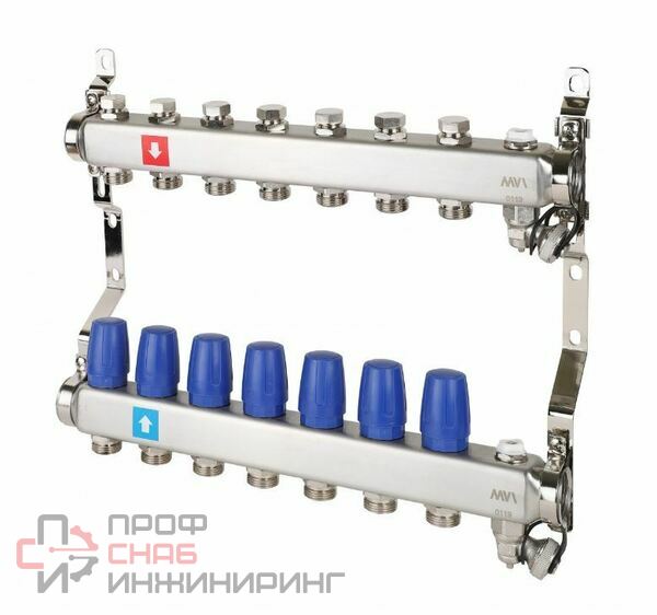 Коллекторные блоки MVI предназначены для распределения потока рабочей среды систем водяного отопления по потребителям. При этом под «потребителем» понимается отдельный нагревательный прибор или группа приборов, контур или петля «теплого пола», отдельные части или ветви системы. Коллекторный блок объединяет в себе подающий и обратный коллекторы из нержавеющей стали, запорные клапаны, термостатические клапаны (с возможностью установки электротермического сервопривода) и крепежные кронштейны. Коллекторные блоки могут работать как на водяном, так и низкозамерзающем (гликолевом) теплоносителе. Коллекторные блоки выпускаются с количеством выходов от 2 до 12. Присоединение циркуляционных петель осуществляется с помощью фитингов стандарта «евроконус» 3/4" (НР).