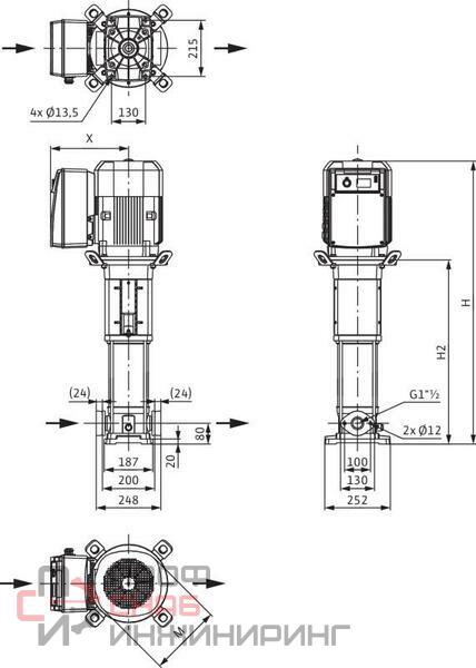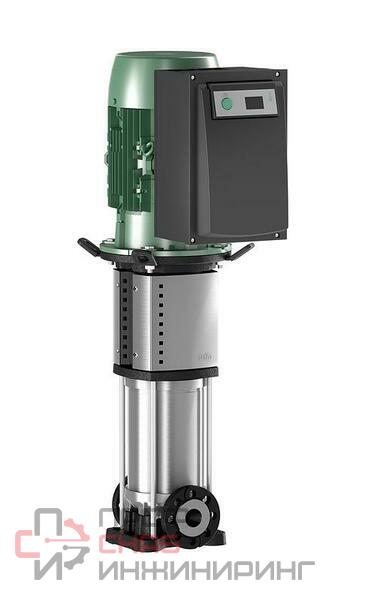 Высокоэффективный высоконапорный центробежный насос вертикального исполнения с линейными подсоединениями, электродвигатель IEC класса эффективности двигателя IE4 с интегрированным частотным преобразователем с воздушным охлаждением. Встроенный частотный преобразователь позволяет варьировать частоту вращения, регулировать давление и ПИД-регулятор.