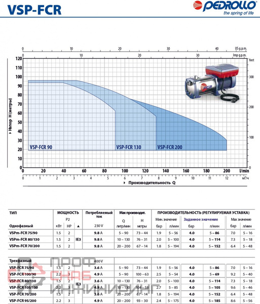 Энергосберегающий электронасос "Центробежный многоступенчатый насос Pedrollo с инвертором VSP-FCR 95/200" может применяться для:подачи чистой воды или жидкостей без абразивных частиц и неагрессивных к материалам, из которых изготовлен насос;подачи воды в бытовых и промышленных целях.Условия применения:устанавливается в закрытом помещении или месте, защищённом от атмосферных воздействий;температура окружающей среды до +40 °C.Блок управления насосом, благодаря частотно-регулируемому преобразователю напряжения (инвертору), позволяет регулировать скорость двигателя в зависимости от количества подаваемой воды, снижая потребление энергии и сохраняя постоянное давление в системе.Инвертор, работающий от однофазного или трёхфазного напряжения, обеспечивает трёхфазное выходное напряжение, которое приводит в действие двигатель класса эффективности IE3.ЗАЩИТА: от «сухого хода», перегрева, а также коротких замыканий, непрерывный мониторинг состояния датчиков насоса и блока управления.