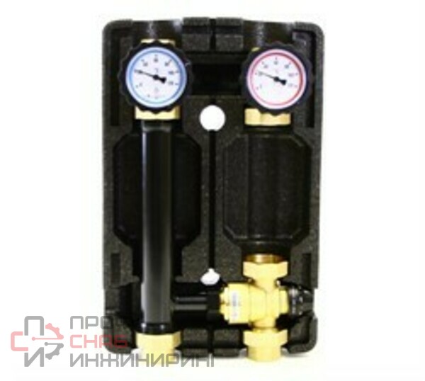 Насосно-смесительная группа Uni-Fitt DN25 с трехходовым смесительным клапаном без насоса применяется в контурах, где предусмотрено регулирование температуры подачи, таких как радиаторное отопление, теплые полы, системы нагрева воды и др., в том числе в системах с погодозависимым управлением. Для автоматического регулирования требуется установка сервопривода на смесительный клапан. Применяется для создания многоконтурных систем отопления с индивидуальными насосами в отдельных контурах. Такие системы характеризуются высокой стабильностью работы, повышенными комфортностью и надёжностью. Модульная конструкция обеспечивает компактность и простоту монтажа. Монтировать насосную группу можно как отдельно, так и на распределительном коллекторе. Корпус насосной группы выполняется из латуни, блочная теплоизоляция – из вспененного полипропилена EPP.Данная модель насосной группы 492 поставляется с трехходовым смесительным клапаном с подключаемым байпасом мощностью до 31 кВт. Подача осуществляется c помощью циркуляционного насоса (в комплект не входит, опционно). В комплект поставки насосной группы входят трехходовой смесительный клапан, шаровой кран обратной линии с обратным клапаном и встроенным термометром (цвет рукоятки синий, шкала температур от 0 до 120 оС), шаровой кран в линии подачи со встроенным термометром (цвет рукоятки красный, шкала температур от 0 до 120 оС), накидные гайки для подключения насоса 1" 1/2 НГ, патрубок обратного трубопровода, блочная EPP изоляция (передний и задний кожух), обратный клапан и подключение к коллектору. Монтажная длина циркуляционного насоса – 180 мм, подключение – G 1" 1/2.Подключение насосной группы к контуру системы отопления – G 1" внутренняя резьба, подключение к коллектору – G 1" внутренняя резьба. Максимальное рабочее давление – 10 бар, Kvs прямой насосной группы – 8, Kvs трёхходового смесительного клапана – 7. Диапазон регулирования термосмесительного клапана составляет 20-45 оС. Межосевое расстояние между коллекторами составляет 125 мм.