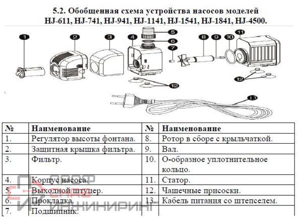 Насос Vodotok HJ-611 - предназначен для создания фонтанов, горок или водопадов в декоративных водоемах, а также в больших аквариумах. Преимуществами данных насосов являются простота и компактность конструкции, высокая экономичность, оптимальные характеристики. Насосы моделей HJ-311, HJ-611, HJ-4500 оснащены регулятором, позволяющим изменять высоту фонтана. Эти насосы не предназначены для перекачивания агрессивных и абразивных веществ, соленой воды, легковоспламеняющихся, взрывоопасных жидкостей и питьевого водоснабжения.