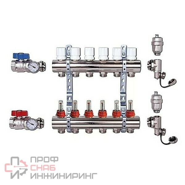 Коллекторные группы из латуни с расходомерами предназначаются для распределения потока транспортируемой среды по контурам теплого пола, рассчитана на применение в системах водяного отопления с максимальной рабочей температурой 70 °C и давлением не более 6 бар, в качестве рабочей среды может применяться вода или незамерзающие гликолевые смеси. Присоединение трубных петель осуществляется с помощью фитингов стандарта "евроконус". Ручные настроечные клапаны с расходомерами позволяют произвести точную регулировку расхода теплоносителя индивидуально в каждом циркуляционном контуре .