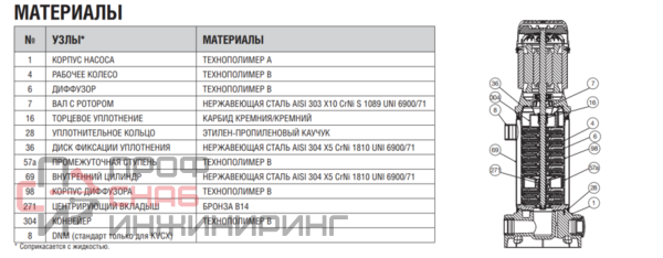 Вертикальные многоступенчатые центробежные насосы предназначены для использования в системах водоснабжения и повышения давления. Подходят для повысительных установок, подачи в емкости, систем орошения дождевой водой и сельскохозяйственного полива, систем пожаротушения и промывочных систем, перекачки конденсата и охлаждающей воды. Инновационная и надежная конструкция. Корпус гидравлики с присоединительными отверстиями выполнен из технополимера с металлическими резьбовыми вставками. Рабочие колеса, диффузоры и крышки диффузоров – технополимер. Корпус гидравлической части, износные кольца и фланец торцевого уплотнения – нержавеющая сталь AISI 303. Торцевое уплотнение – карбид кремния/графит. Насосы комплектуются асинхронным электродвигателем с воздушным охлаждением. Для обеспечения низкого уровня шума и длительного срока службы вал двигателя вращается на подшипниках увеличенного размера, заполненных смазкой на весь срок службы. В однофазной версии встроена защита от перегрузки. Для защиты трехфазного электродвигателя следует обеспечить защиту от перегрузки, соответствующую действующим нормам. Соответствие стандартам CEI 2-3/CEI 61/69 (EN 60335-2-41)