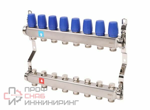 Коллекторные блоки MVI предназначены для распределения потока рабочей среды систем водяного отопления по потребителям. При этом под «потребителем» понимается отдельный нагревательный прибор или группа приборов, контур или петля «теплого пола», отдельные части или ветви системы. Коллекторный блок объединяет в себе подающий и обратный коллекторы из нержавеющей стали, запорные клапаны, термостатические клапаны (с возможностью установки электротермического сервопривода) и крепежные кронштейны. Коллекторные блоки могут работать как на водяном, так и низкозамерзающем (гликолевом) теплоносителе. Коллекторные блоки выпускаются с количеством выходов от 2 до 12. Присоединение циркуляционных петель осуществляется с помощью фитингов стандарта «евроконус» 3/4" (НР).