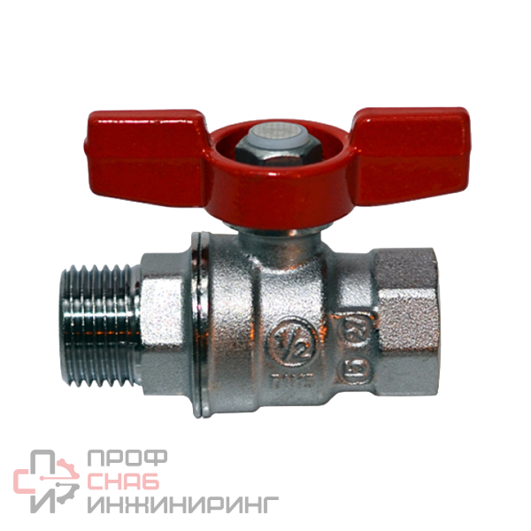 Кран шаровой полнопроходной, резьба внутренняя/наружная, хромированный, ручка - бабочка красная.