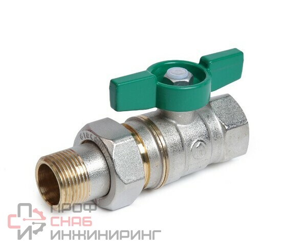 Кран шаровой со стандартным проходом, с зеленой рукояткой - бабочкой, с отводом, хромированный, с низким содержанием свинца, для питьевой воды.
