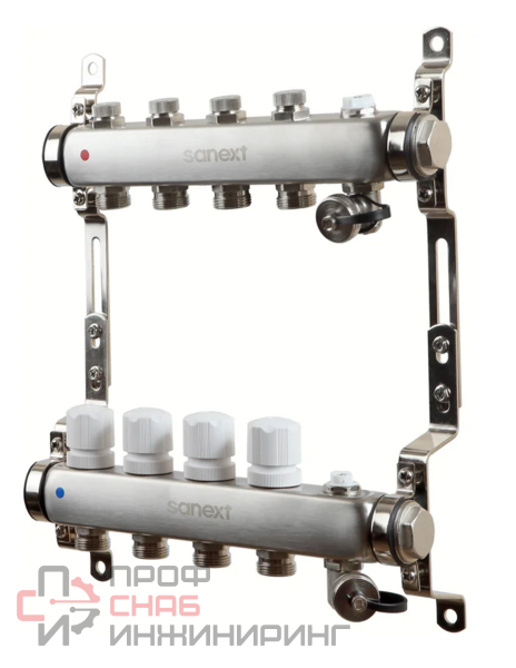 Коллектор SANEXT для тёплого пола на 4 контура (8 выходов) выполнен из нержавеющей стали и предназначен для надёжного распределения теплоносителя в системах водяного отопления. Концевая модель оснащена запорными вентилями, автоматическим воздухоотводчиком и дренажным клапаном, что обеспечивает удобство эксплуатации и технического обслуживания. Присоединение к трубопроводу осуществляется через внутреннюю резьбу 1", выходы — с наружной резьбой ¾" под евроконус, шаг между осями выходов — 50 мм. Диаметры коллектора и контуров — 25 и 20 мм соответственно. Максимальное рабочее давление — 10 бар, температура — до 95 °C.