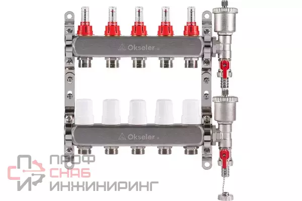 Коллекторный блок Okseler с расходомерами и автоматическими воздухоотводчиками — коллектор распределительный для систем отопления и теплого водяного пола. Коллекторный блок состоит из подающие и обратной гребенок, гребенки имеют от 2 до 12 выходов. Подающая гребенка оснащается расходомерами, что позволяет регулировать каждый отдельный контур. Обратная гребенка оснащена термостатическими клапанами (есть возможность дополнительно установить термоэлектрические сервоприводы).