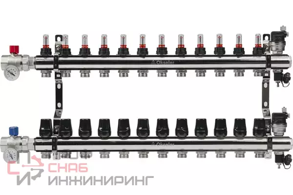 Латунный коллекторный блок OKSELER с расходомерами и автоматическими воздухоотводчиками. Профессиональное решение для систем водяного отопления и теплых полов. Коллектор из латуни CW617N обеспечивает равномерное распределение теплоносителя по контурам с точным контролем расхода и температуры. В комплекте расходомеры, термометры и автоматические воздухоотводчики.