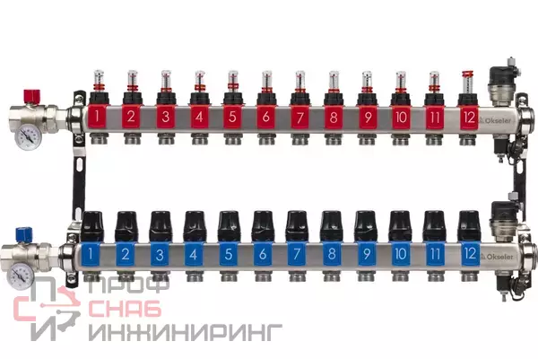 Коллекторный блок OKSELER из нержавеющей стали с расходомерами и автоматическими воздухоотводчикамиПредназначен для систем водяного отопления и теплых полов. Обеспечивает точное распределение теплоносителя по контурам, контроль расхода и температуры. Изготовлен из нержавеющей стали AISI 304 для долговечной работы в системах отопления.