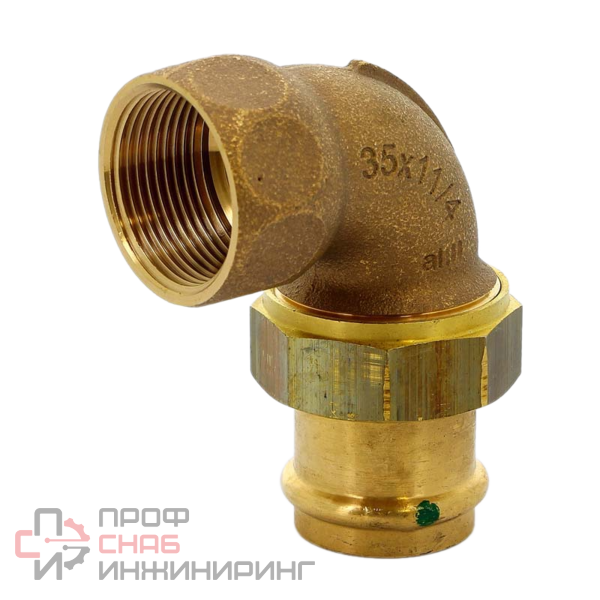 Угол пресс-В с разъёмным соединением с плоской прокладкой бронза Sanpress VIEGA 35x1 1/4" - незаменимый фитинг для изменения направления трубопровода при переходе от прессового к резьбовому соединению медных труб в монтаже систем холодного и горячего водоснабжения, систем отопления, сантехнического оборудования.