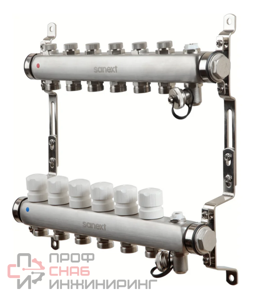 Коллектор SANEXT для тёплого пола на 6 контуров (12 выходов) изготовлен из прочной нержавеющей стали и предназначен для равномерного распределения теплоносителя в системах водяного отопления. Концевая модель оснащена запорными вентилями, автоматическим воздухоотводчиком и дренажным клапаном, обеспечивая удобное управление и обслуживание системы. Коллектор имеет внутреннюю резьбу 1" для подключения к трубопроводу и выходы с наружной резьбой ¾" под евроконус с шагом 50 мм. Диаметры коллектора и контуров — 25 и 20 мм соответственно. Рабочее давление — до 10 бар, температура — до 95 °C.