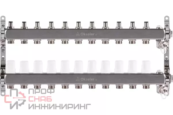Коллектор распределительный для систем отопления и теплого водяного пола. Коллекторный блок состоит из подающей и обратной гребенок. Подающая гребенка оснащается балансировочными клапанами, что позволяет регулировать каждый отдельный контур. Обратная гребенка оснащена термостатическими клапанами (есть возможность дополнительно установить термоэлектрические сервоприводы).