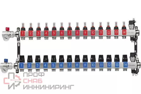 Коллекторный блок OKSELER из нержавеющей стали с расходомерами и автоматическими воздухоотводчиками. Предназначен для систем водяного отопления и теплых полов. Обеспечивает точное распределение теплоносителя по контурам, контроль расхода и температуры. Изготовлен из нержавеющей стали AISI 304 для долговечной работы в системах отопления.