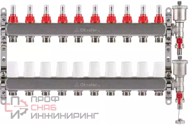 Коллекторный блок Okseler с расходомерами и автоматическими воздухоотводчиками — коллектор распределительный для систем отопления и теплого водяного пола. Коллекторный блок состоит из подающие и обратной гребенок, гребенки имеют от 2 до 12 выходов. Подающая гребенка оснащается расходомерами, что позволяет регулировать каждый отдельный контур. Обратная гребенка оснащена термостатическими клапанами (есть возможность дополнительно установить термоэлектрические сервоприводы).