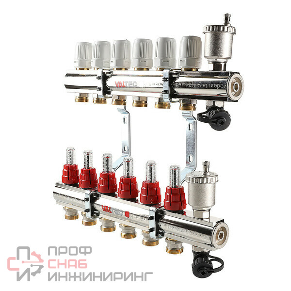 Коллекторный блок Valtec — это латунный распределительный узел для систем отопления и тёплого пола, оснащённый термостатическими клапанами и встроенными расходомерами, обеспечивающий точную балансировку и индивидуальное регулирование каждого контура; изделие выполнено из высококачественной латуни, отличается высокой прочностью, коррозионной стойкостью и надёжностью, позволяет подключать термостатические приводы для автоматического управления температурой, упрощает монтаж и обслуживание системы и обеспечивает стабильную и энергоэффективную работу отопительных контуров.
