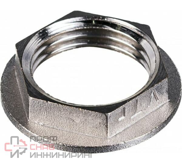 Контргайка – простой и эффективный вид гаечных замков, предназначенных для недопущения самопроизвольного раскручивания элементов резьбовых соединений (муфт, сгонов, пр.) при вибрации, гидравлических ударах. Реборда, выступающая за шестигранную часть гайки, увеличивает надежность фиксации, повышает герметичность, улучшает внешний вид соединения (скрывает волокна уплотнителя). Как и другие резьбовые фитинги VALTEC, контргайка с ребордой выполнена методом горячего штампования из латуни CW617N с последующим никелированием, имеет трубную цилиндрическую резьбу, совместимую с конической.