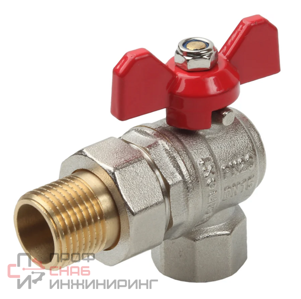 Угловой шаровой кран SANEXT Ду 15 с присоединением НР-ВР ½" и американкой (сгоном) предназначен для установки в системах водоснабжения, отопления и других инженерных коммуникациях, где требуется надёжное запорное устройство с удобным угловым подключением. Клапан имеет двухходовую конструкцию, неполнопроходной тип и рассчитан на рабочее давление до 40 бар при температуре среды до 130 °C. Корпус, шар и шток выполнены из латуни с никелированным покрытием, рукоятка-бабочка — из алюминия. Комбинированная резьба (внутренняя и наружная) обеспечивает удобство монтажа. Подходит для воды, водо-гликолевых растворов, газа и других неагрессивных сред.