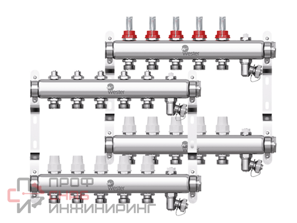 Коллекторы Wester W902 из нержавеющей стали с расходомерами и запорными клапанами предназначены для оптимизации и контроля распределения теплоносителя в системах радиаторного отопления и подогрева пола. Поставляются с расходомерами в предварительно собранном виде. Укомплектованы кронштейнами для крепления в распределительном шкафу или на стене, воздухоотводчиками для удаления воздуха и дренажными кранами для операций заполнения/слива системы. На подающем коллекторе установлены регуляторы расхода, на коллекторе обратки установлены запорные клапаны.