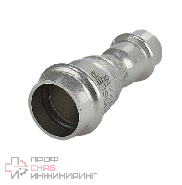 Двухраструбная пресс-муфта из нержавеющей стали предназначена для соединения тонкостенных стальных труб в системах водоснабжения, отопления, других инженерных и технологических установках с рабочей температурой до 95 °С. Номинальное давление – 16 бар. Пресс фуфта изготовлена из стали AISI 304. Материал уплотнительных колец – эластомер EPDM Sh70. Достоинством бесштуцерных соединителей является малый коэффициент местного сопротивления (сужение канала практически отсутствует). Фитинг рассчитан на обжатие с помощью пресс-инструмента V-профиля.