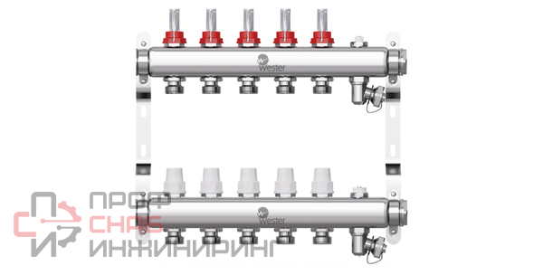 Коллектор Wester из нержавеющей стали с регулирующими и запорными клапанами, предназначен для оптимизации и контроля распределения теплоносителя в системах радиаторного отопления и подогрева пола. Укомплектован кронштейнами для крепления в распределительном шкафу или на стене, переходниками, воздухоотводчиками для удаления кислорода и дренажными кранами для операций заполнения/слива системы. Присоединение 3/4" под "евроконус". На каждой отходящей линии распределителя установлен регулировочный клапан. На каждой входящей линии распределителя обратки установлен запорный клапан.