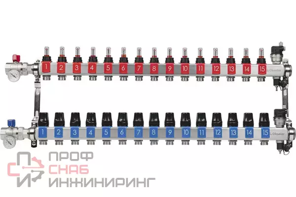 Коллекторный блок OKSELER из нержавеющей стали с расходомерами и автоматическими воздухоотводчикамиПредназначен для систем водяного отопления и теплых полов. Обеспечивает точное распределение теплоносителя по контурам, контроль расхода и температуры. Изготовлен из нержавеющей стали AISI 304 для долговечной работы в системах отопления.