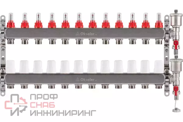Коллекторный блок Okseler с расходомерами и автоматическими воздухоотводчиками — коллектор распределительный для систем отопления и теплого водяного пола. Коллекторный блок состоит из подающие и обратной гребенок, гребенки имеют от 2 до 12 выходов. Подающая гребенка оснащается расходомерами, что позволяет регулировать каждый отдельный контур. Обратная гребенка оснащена термостатическими клапанами (есть возможность дополнительно установить термоэлектрические сервоприводы).