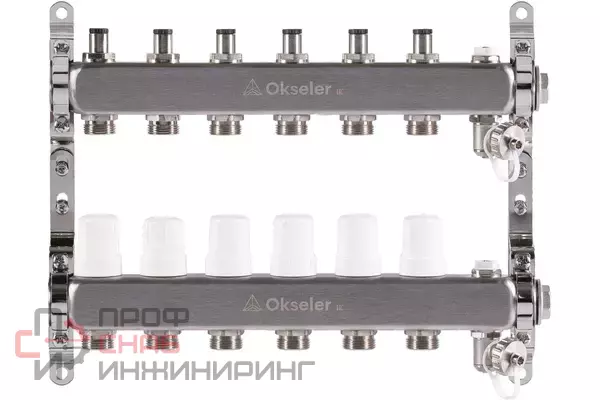 Коллектор распределительный для систем отопления и теплого водяного пола. Коллекторный блок состоит из подающей и обратной гребенок. Подающая гребенка оснащается балансировочными клапанами, что позволяет регулировать каждый отдельный контур. Обратная гребенка оснащена термостатическими клапанами (есть возможность дополнительно установить термоэлектрические сервоприводы).