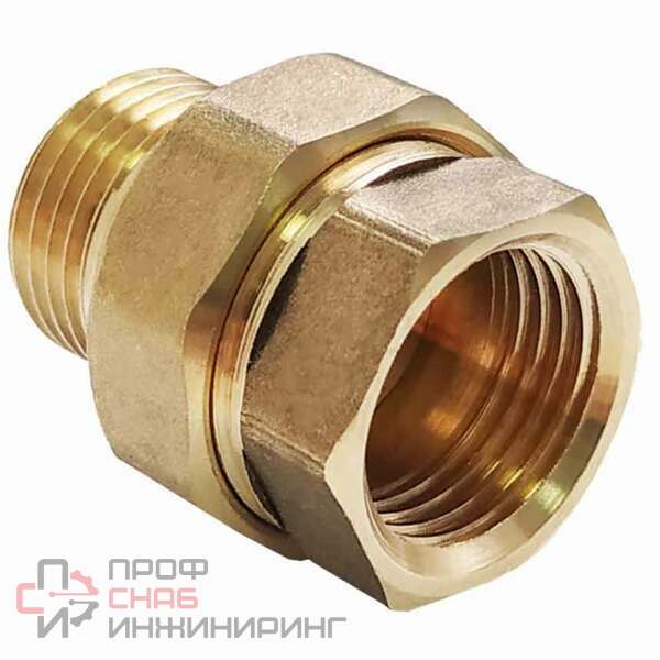 Разъемный сгон, смонтированный из двух частей с помощью накидной гайки (соединение типа «американка»). Резьба – внутренняя/наружная, цилиндрическая трубная по ГОСТу 6357-81. Детали изготовлены методом горячей объемной штамповки из высококачественной латуни марки ЛС 59-1. Уплотнительное кольцо – из синтетического каучука EPDM. Фитинги рассчитаны на рабочее давление (PN) 2,5 и 4,0 МПа и температуру транспортируемых сред от -20 до +150 °С.