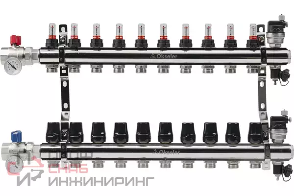 Профессиональное решение для систем водяного отопления и теплых полов. Коллектор из латуни CW617N обеспечивает равномерное распределение теплоносителя по контурам с точным контролем расхода и температуры. В комплекте расходомеры, термометры и автоматические воздухоотводчики.