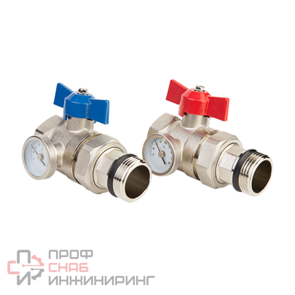 Комплект кранов предназначен для систем напольного отоплени. Применяется для подключения коллекторных блоков. Благодаря наличию термоментов, отображает температуру подающей и обратной линии.