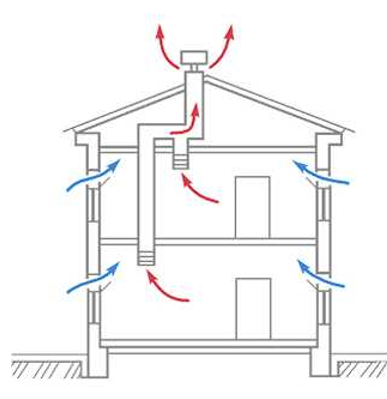 Через неплотности в окнах/дверях (инфильтрация) или специальные приточные клапаны (стеновые или оконные) свежий воздух попадает в помещение. Загрязненный воздух удаляется через вертикальные вентиляционные каналы (в стенах кухни, с/у), которые выводятся на крышу.